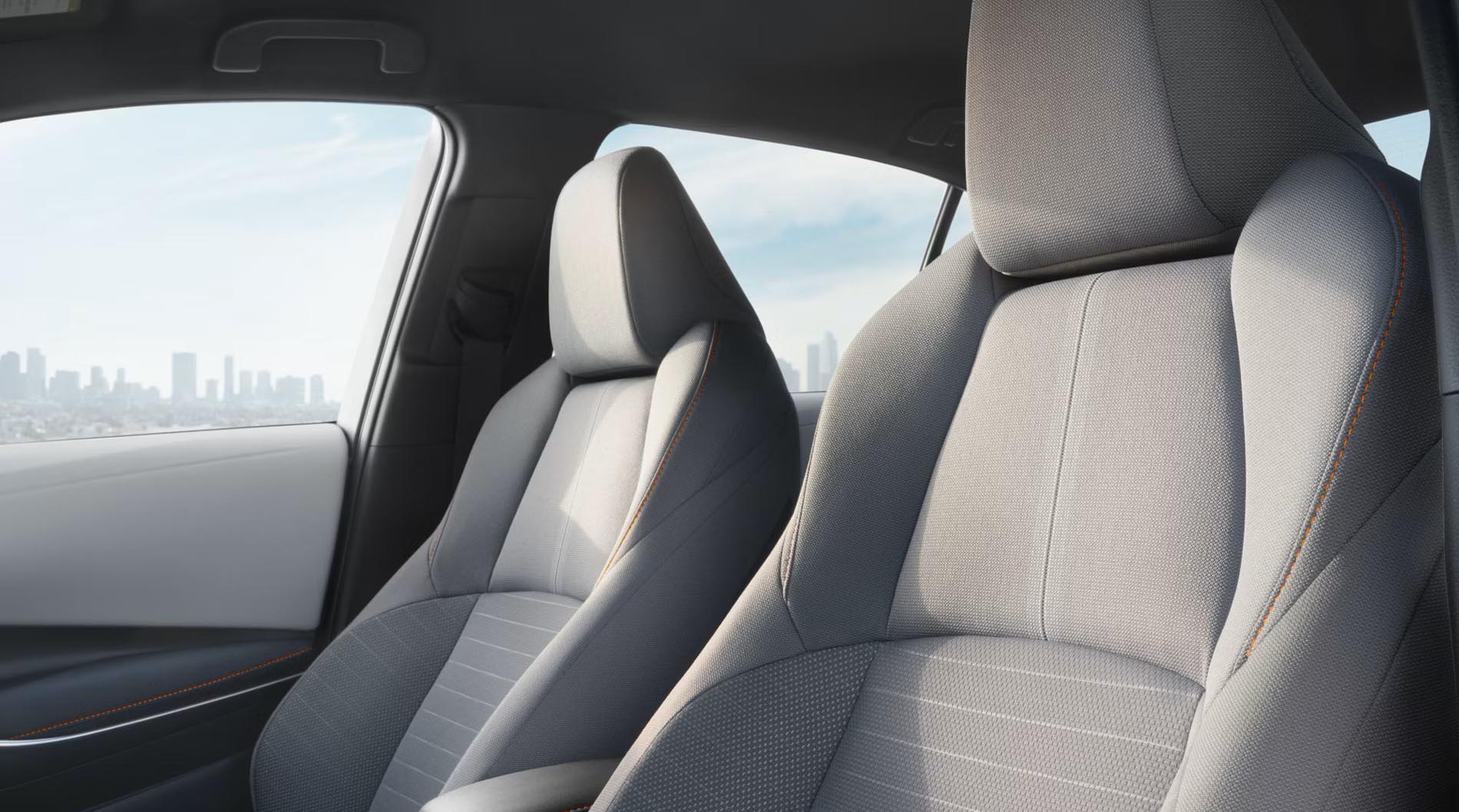· - Moonstone fabric seats with orange stitching